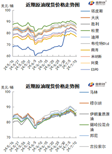 本周,国际原油现货均价环比涨跌不一。中东原油市场,沙特下调对亚洲客户的原油官方售价。沙特阿美公司在一份声明中指出,沙特已经将8月销售到亚洲的阿拉伯轻质原油的官方售价下调至每桶对阿曼/迪拜均价升水1.8美元。这比7月官价低0.6美元,7月阿拉伯轻质原油的官价为每桶对阿曼/迪拜均价升水2.4美元。8月官价下调幅度基本与市场一致,因为亚洲炼油商的消息人士此前预计8月阿拉伯原油官价可能下滑0.6-0.8美元。亚洲是沙特出口原油的重要市场,占其出口量大约80%的比例。沙特销售至亚洲的原油官价下调是因为非OPEC的供应继续增加和全球经济面临压力以及需求前景充满不确定性。此外,8月装巴士拉中质原油交易开始,7月4日有商家提供8月装巴士拉中质原油船货。
